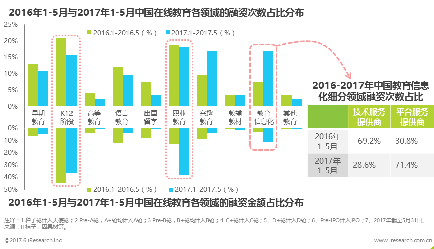 从在线教育各细分领域的融资次数来看,最受资本市场青睐的在线教育类型依然是K12教育、职业教育以及语言教育。2017年兴趣教育和教育信息化领域的融资次数相比于2016年同期出现明显增长,占比均为16.9%,其中教育信息化中有超过70%的融资次数集中于平台服务提供商,这可能主要是以下两方面的原因,其一,直播互动教学的火热一直延续到现在,直播互动教学的效果和场景已经逐步受到认可;其二,直播技术等新兴技术的发展,使得在线教育的行业壁垒相对于其他方面更容易构筑。