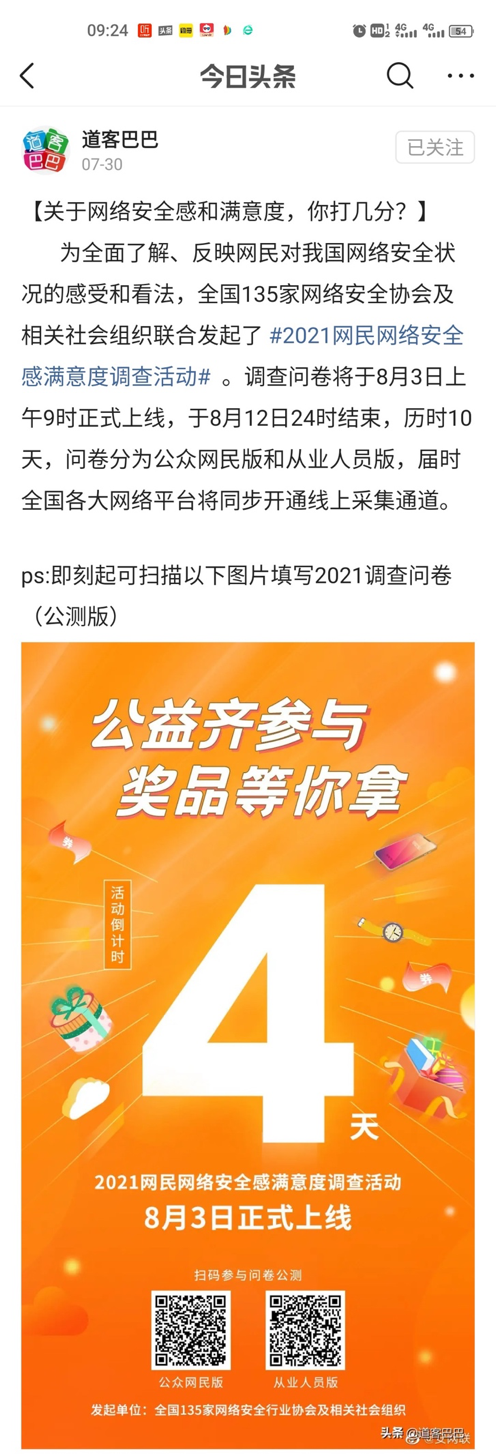 发表日期:2021年08月12日7月30日,北京网络空间安全协会发布关于开展“2021网民网络安全感满意度调查活动”的公告,本次调查活动由全国135家网络安全行业协会及相关社会组织共同发起,通过采集网民上网用网的感受、评价、建议及意见,为国家和有关部门开展互联网治理与监管提供详实的网情民意数据支撑,助力提高网民的安全感、幸福感、获得感。